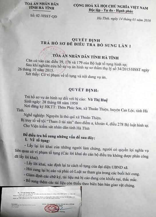 Ngày 6/2, nguồn tin của PV VTC News cho biết, ngày 14/1 Tòa án Nhân dân tỉnh Hà Tĩnh vừa có quyết định trả hồ sợ vụ án Võ Thị Huệ (nguyên thủ quỹ xã Thuần Thiện, huyện Can Lộc, tỉnh Hà Tĩnh) tham ô hơn một tỷ đồng để điều tra bổ sung lần 1.