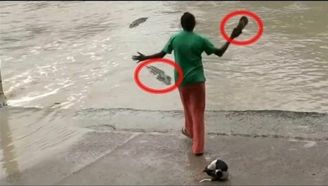 Nữ 'cao thủ' cầm dép tông đuổi cá sấu bơi trối chết