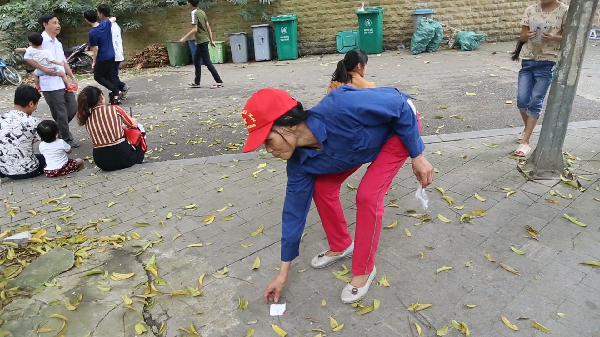 Bà Cầu nhặt rác thải do người dân ăn uống xong không vứt vào thùng rác.