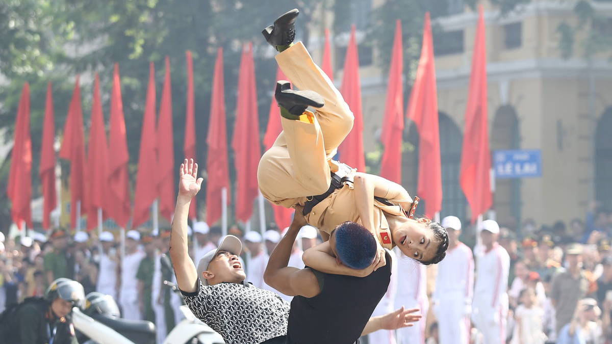 Khán giả phấn khích vỗ tay không ngớt khi một nữ chiến sĩ CSGT bất ngờ bật người xoay tròn trên không, thực hiện cú san tô đẹp mắt trước khi quật ngã cùng lúc hai thanh niên.