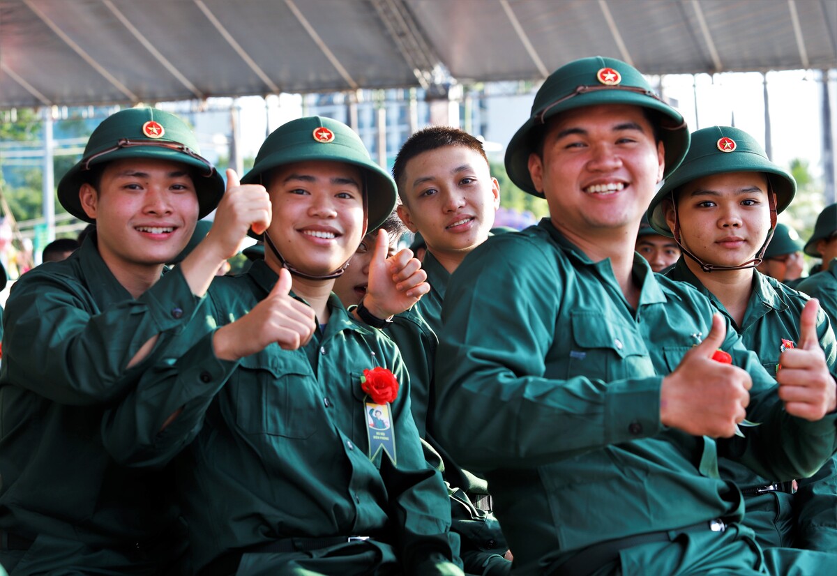 Giữa sắc đỏ của cờ Tổ quốc và tiếng trống hội rộn rã, hình ảnh những chàng trai mười tám, đôi mươi trong bộ quân phục còn thơm mùi vải mới, đội mũ vây sao sáng rực, đã tạo nên một bức tranh nhiệt huyết, tươi trẻ.