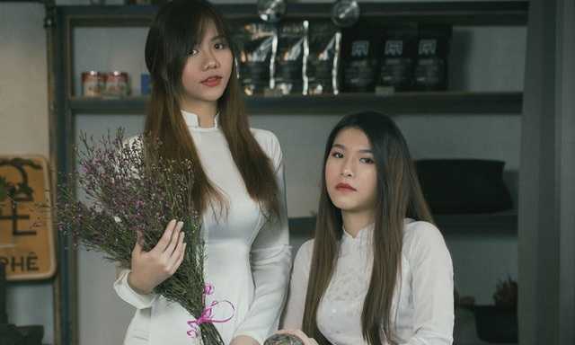 Hai thiếu nữ Ánh Giang và Minh Dương xinh đẹp thướt tha trong áo dài lụa trắng.