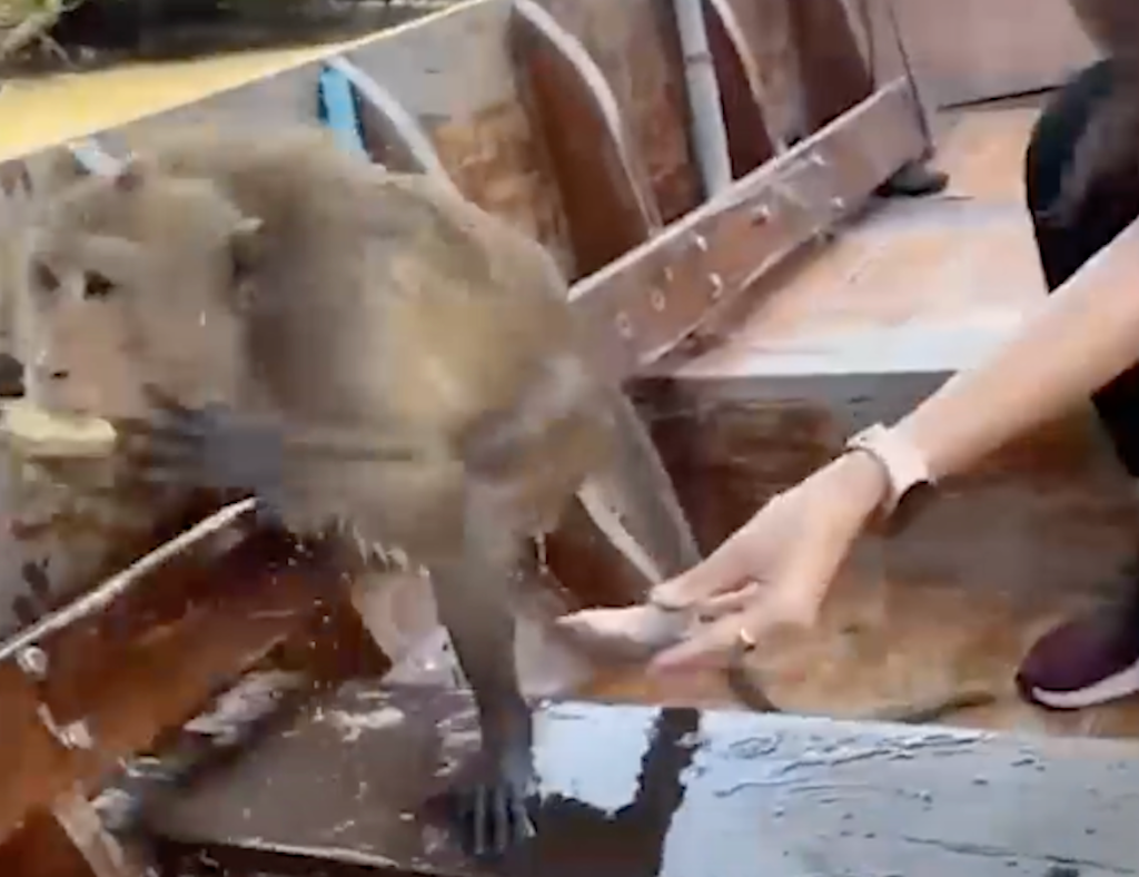 Nữ du khách hét toáng khi thấy bầy khỉ bơi lên thuyền cướp đồ ăn