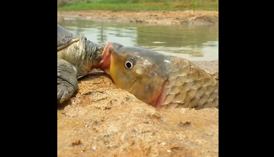 "Nụ hôn" của rùa và cá chép khiến nhiều người tưởng đây là vụ đánh nhau, xem đến cuối clip mới vỡ lẽ, hóa ra cá chép nhờ rùa mà thoát kiếp nạn.