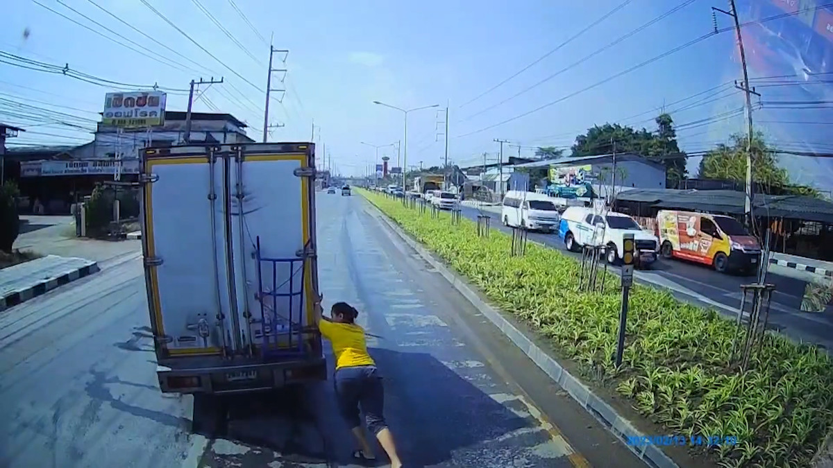 Cô Thitima một mình đẩy chiếc xe tải giao hàng bị hỏng giữa dòng xe cộ ở tỉnh Ratchaburi, Thái Lan.