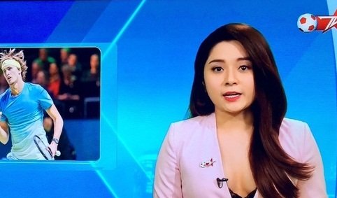 Theo đó, khi lên sóng dẫn chương trình bản tin thể thao, nữ MC mặc một chiếc áo vest ngoài màu hồng nhạt khoét cổ khá rộng để lộ áo bên trong và một phần vòng một.