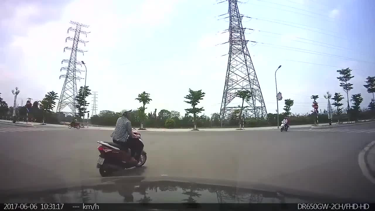 Người phụ nữ đi xe máy xi nhan trái, sau đó lưỡng lự rồi rẽ phải khiến tài xế ô tô gắn camera hành trình một phen bối rối không biết xử lý thế nào.