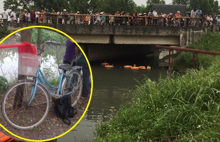 Tại hiện trường, chiếc xe đạp của nạn nhân được dựng trên bờ, chiếc cặp sách được đặt dưới đất và một chiếc bàn hót rác đặt trên giỏ xe.