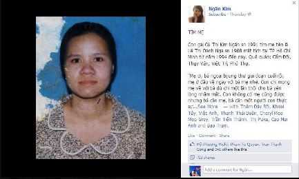 Con gái Cù Thị Kim Ngân sinh năm 1991 tìm mẹ tên là Lê Thị Oanh Nga sinh năm 1968. Mẹ mất tích tại TP.HCM từ năm 1994 đến nay. Quê quán: Cẩm Đội, Thụy Vân, Việt Trì, Phú Thọ.