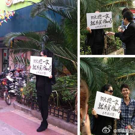 Đứng trên đường phố đông đúc, cô gái mặc nguyên một "cây đen", đeo kính râm và giơ một tấm biển có nội dung "10 nhân dân tệ cho một cái ôm để kiếm tiền mua iPhone 5".