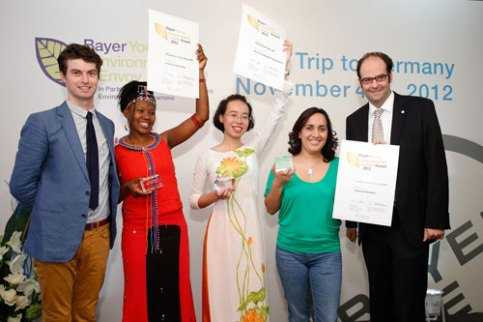 | Mai Anh (áo dài, đứng giữa) cùng với đại sứ Costa Rica (áo xanh lá) và đại sứ Kenya (áo đỏ) nhận giải thưởng Nhà lãnh đạo môi trường Bayer toàn cầu năm 2012. |