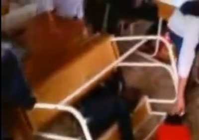 Dùng ghế đánh vào mặt bạn. (Ảnh chụp từ clip)