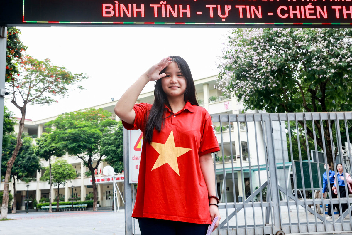 Nổi bật với chiếc áo cờ đỏ sao vàng, thí sinh Nguyễn Hương Quỳnh (THCS Nam Từ Liêm) vui mừng chia sẻ: "Đề tiếng Anh vừa sức, em dự đoán đạt được 8 điểm trở lên. Đến điểm thi em mặc chiếc áo đồng phục của trường có in hình cờ tổ quốc, chiếc áo này rất may mắn và em luôn giữ gìn, chỉ để mặc trong dịp quan trọng".