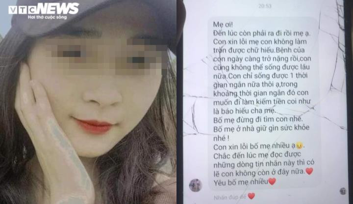 Đến 20h53 cùng ngày, gia đình nhận được những dòng tin nhắn đau lòng được cho là của N.A với nội dung: "Mẹ ơi, đến lúc con phải đi rồi mẹ ạ. Con xin lỗi mẹ, con không làm tròn chữ hiếu. Bệnh của con ngày càng trở nặng rồi, con cũng không thể sống được lâu nữa. Con chỉ sống được thời gian ngắn nữa thôi…".