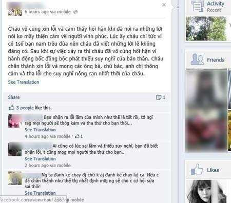 Sau khi sự việc xảy ra thì cháu đã vô cùng hối hận vì hành động bốc đồng bộc phát thiếu suy nghĩ của bản thân. Cháu chân thành xin lỗi và mong các ông bà, chú bác, anh chị thông cảm và tha lỗi cho suy nghĩ nông cạn nhất thời của cháu.