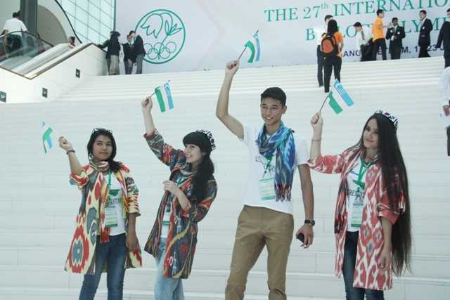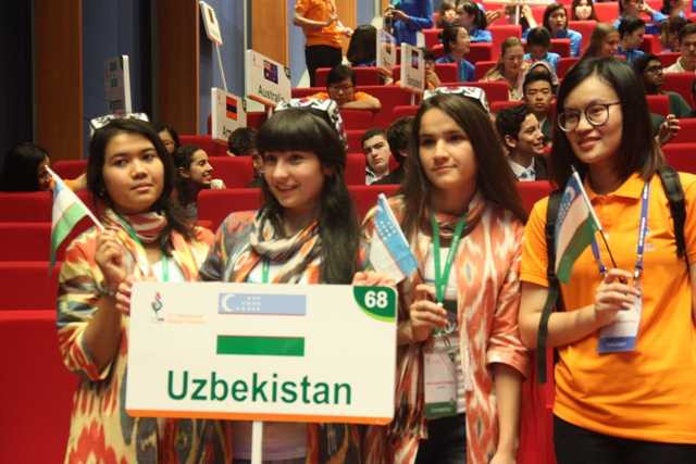| Học sinh đoàn Uzbekistan với cờ tổ quốc rạng rỡ tại Trung tâm Hội nghi quốc gia Mỹ Đình |