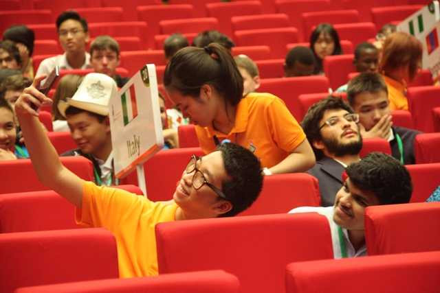 | Tình nguyện viên và học sinh quốc tế ghi lại kỷ niệm trước giờ khai mạc IBO 2016 |