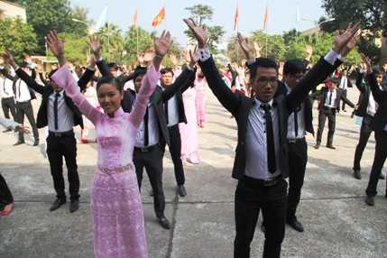 Các nữ sinh trong trang phục áo dài truyền thống và nam sinh viên trong những bộ véc lịch lãm thể hiện từng động tác một cách thành thục