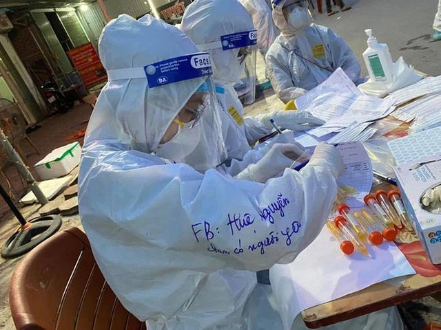Huệ cho biết, bức ảnh đó do một bạn cùng đoàn tình nguyện chụp khi em đang thực hiện công việc ghi chép thông tin các tờ khai lấy mẫu xét nghiệm SARS-CoV-2 cho người dân.