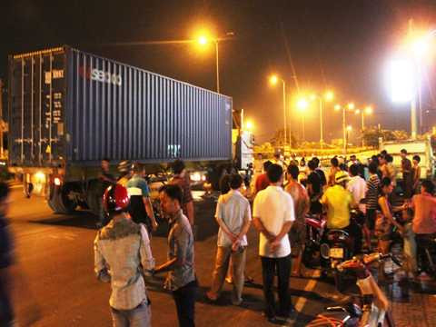 Nhiều người đứng xem không ai cầm được nước mắt khi chứng kiến cảnh cô gái chết thảm dưới bánh xe container, trên chiếc xe máy còn treo lơ lửng hai hộp cơm.