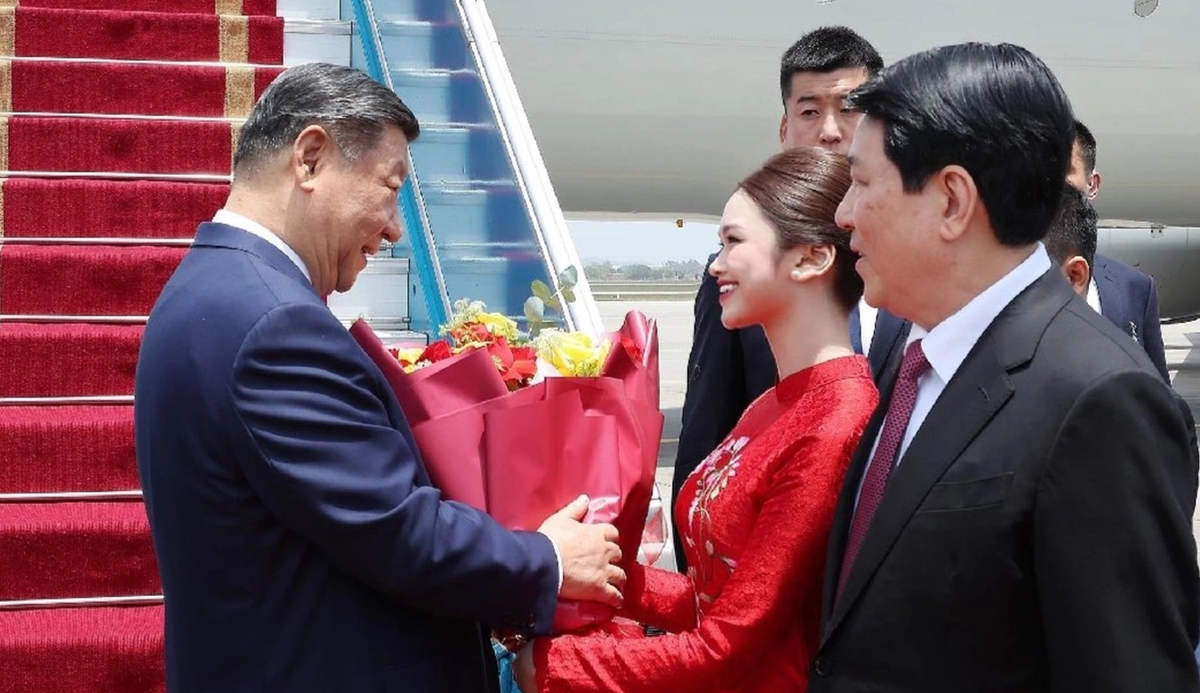 Trưa 14/4, chuyên cơ chở Tổng Bí thư, Chủ tịch Trung Quốc Tập Cận Bình hạ cánh tại sân bay quốc tế Nội Bài, bắt đầu chuyến thăm cấp Nhà nước tới Việt Nam. Ngay khi ông đặt chân xuống sân bay, nữ sinh Việt trong tà áo dài đỏ tươi thắm tiến đến tặng hoa, thay lời chào mừng trang trọng từ Việt Nam. (Ảnh: TTXVN)