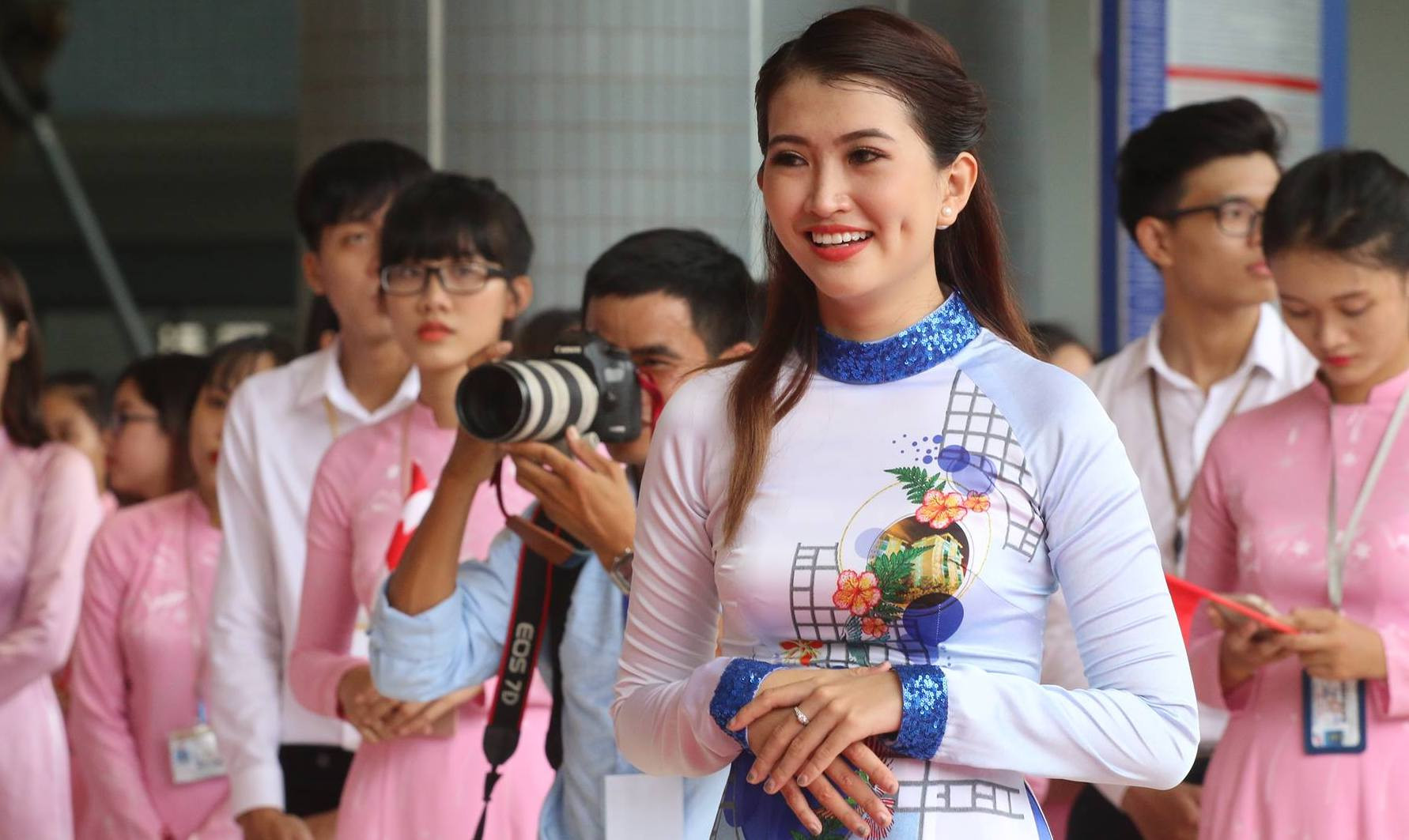 Các nữ sinh viên trường ĐH Tôn Đức Thắng tươi tắn chờ gặp Thủ tướng Canada.