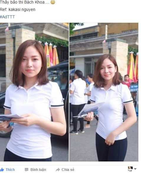 Bức hình về thí sinh xinh đẹp này nhanh chóng thu hút hơn 27.000 like (thích), 1.000 chia sẻ với lời bình: "Thí sinh hot nhất điểm thi Bách Khoa sáng nay. Các bạn Bách Khoa sáng giá nhất rồi!".
