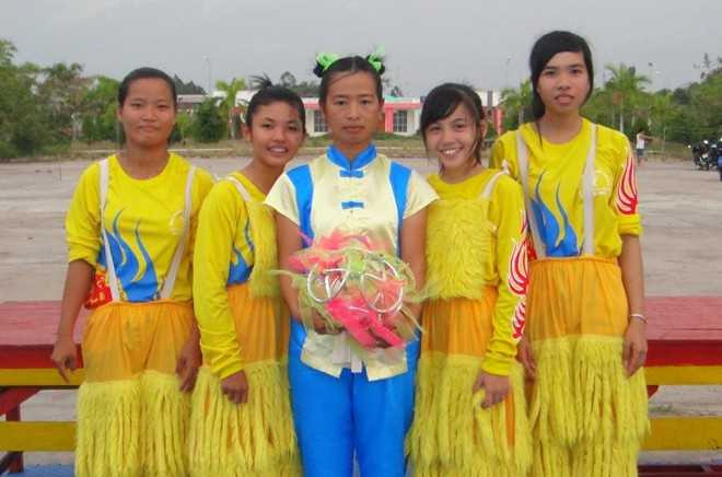 | Phương Anh (thứ hai từ phải sang) là đội trưởng nhóm múa sư tử nữ duy nhất của Việt Nam. |