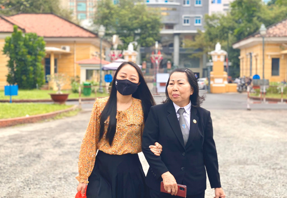 Chị Nguyễn Thị Bích Hường có mặt sớm trước phiên toà phúc thẩm cùng luật sư. (Ảnh: Thy Huệ)