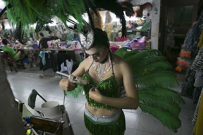 Vũ công chuyển giới ở Chiềng Mai, Thái Lan đang dùng súng bắn keo gắn lại áo ngực trước bắt đầu buổi diễn