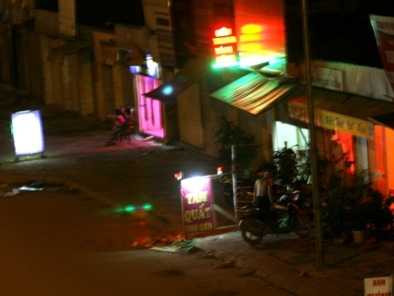 Rồi chú dắt cả đám phi xe rà rà bên lề dọc con đường. Giờ này đường đã ít người qua lại, các quán đèn mờ giăng giăng thứ ánh sáng xanh, đỏ yếu ớt đến mỏi mắt. Trước mỗi cửa quán có 1 -2 cô gái ngồi sẵn, có lẽ để làm công việc “lễ tân”.