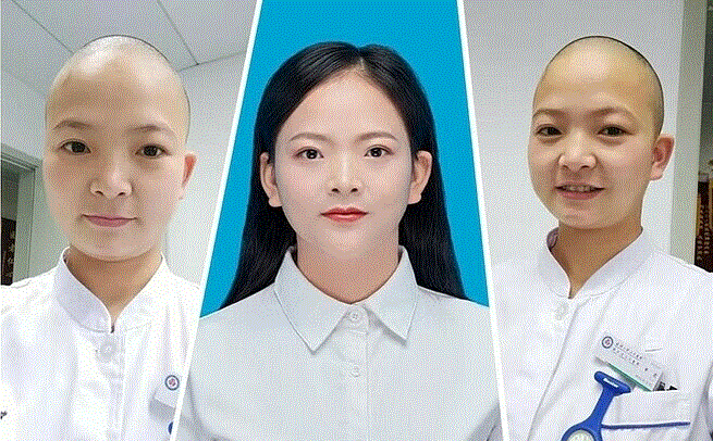 HÌnh ảnh nữ y tá trước và sau khi cạo trọc đầu. (Ảnh: China Daily)