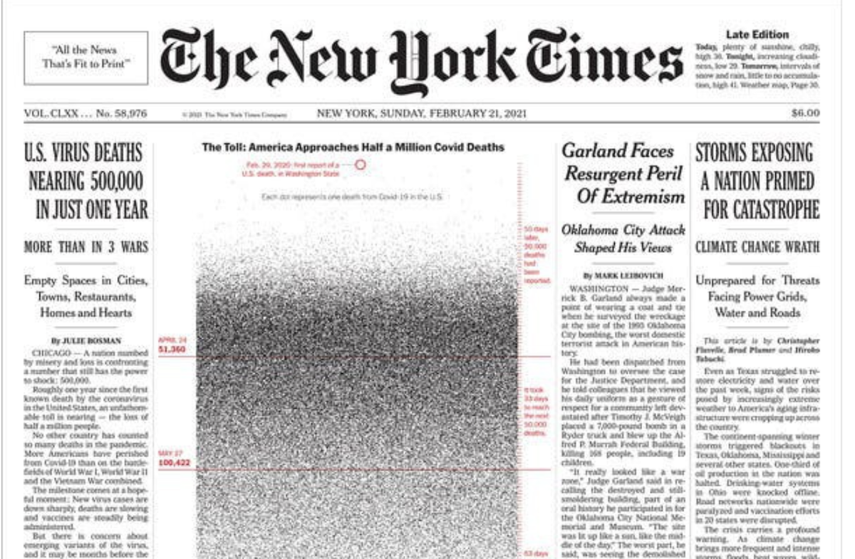 Trang nhất báo giấy New York Times từng được sử dụng để trực quan hóa mức độ nghiêm trọng của đại dịch trước đây. Khi số người chết vì COVID-19 tại Mỹ lên đến 100.000 vào tháng 5 năm ngoái, trang này ghi tên của gần 1.000 người trong đó, tức chỉ 1% tổng số ca tử vong.