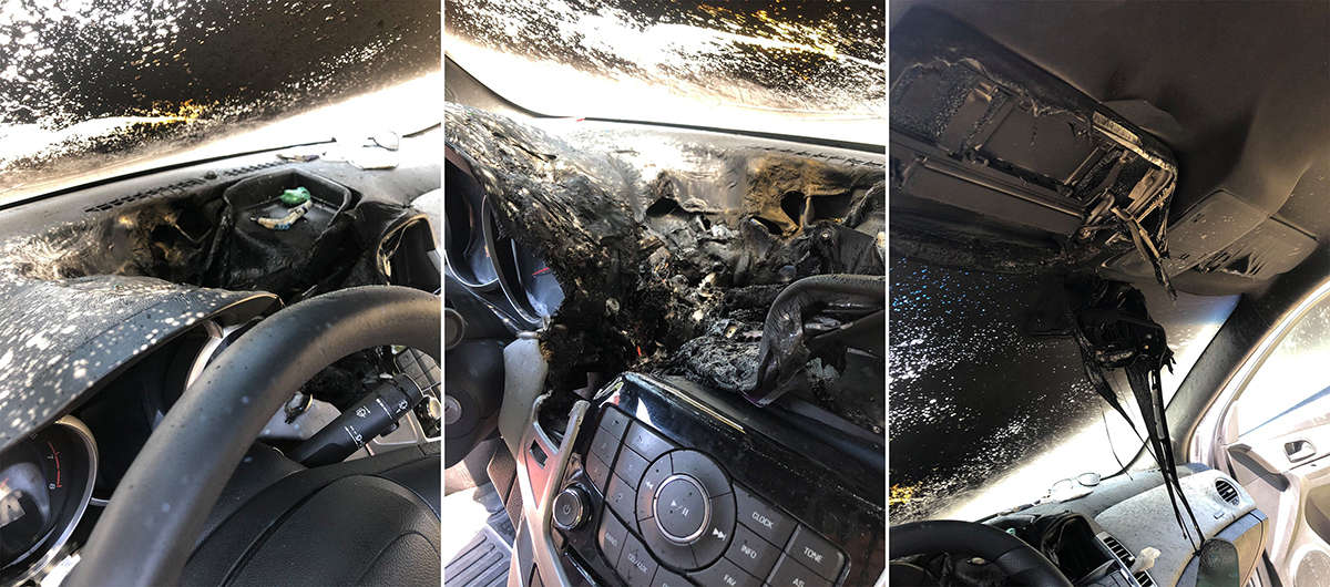 Sở cứu hoả đã đăng một số hình ảnh lên mạng xã hội, kết luận rằng một chai chứa chất khử trùng tay được để lại trên bảng điều khiển. Cũng theo sở cứu hoả, điều tra sơ bộ của họ kết luận rằng "Dường như ánh sáng mặt trời chiếu xuyên qua kính chắn gió vào chai chất khử trùng đủ để gây cháy nổ".