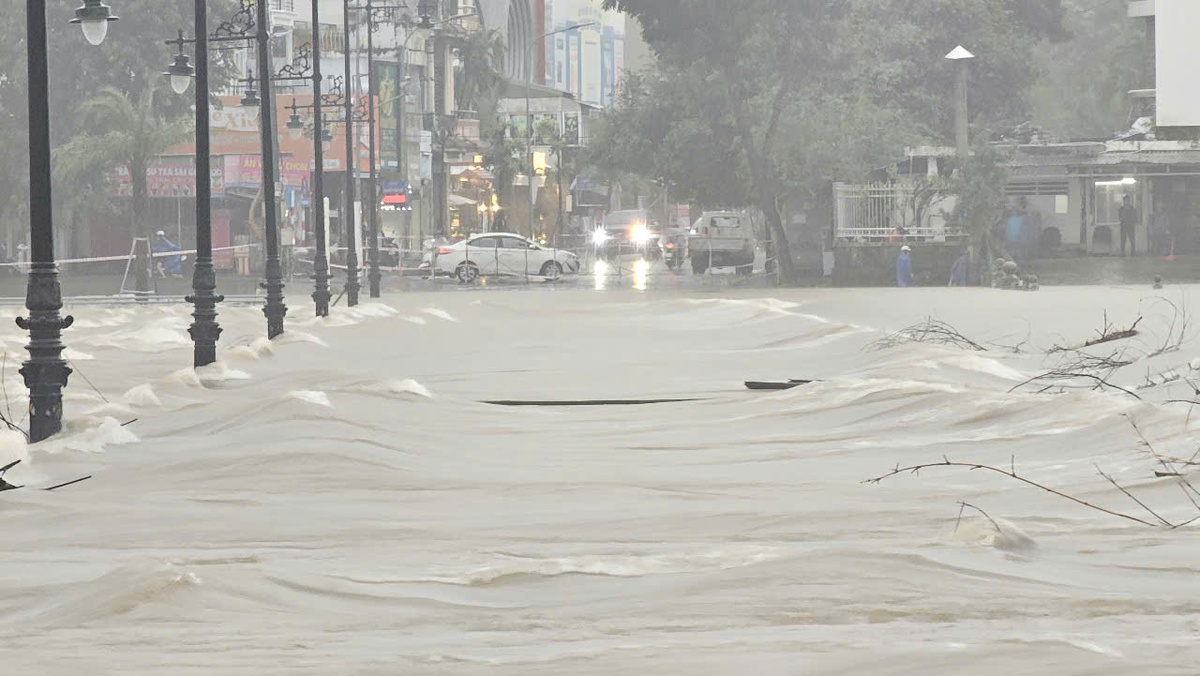 Khu vực Đập Đá đoạn giữa đường Lê Lợi và Nguyễn Sinh Cung (TP Huế) ngập sâu, nước chảy xiết.