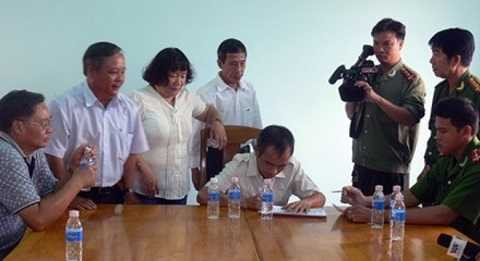 Không khí buổi công bố trở nên nhẹ nhàng hơn khi ông phó viện trưởng VKSND tỉnh Bình Thuận tươi cười đến bắt tay chia sẻ với ông Nén và ông Biện Văn Hoan, Phó Chánh án TAND tỉnh Bình Thuận, thân mật hướng dẫn tỉ mỉ cho ông Nén làm đơn yêu cầu bồi thường oan.