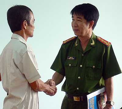 | Đại tá Phạm Thật bắt tay chúc mừng công dân Huỳnh Văn Nén. Ảnh: PHƯƠNG NAM |