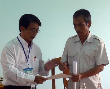 | Ông Biện Văn Hoan, Phó Chánh án TAND tỉnh Bình Thuận, hướng dẫn ông Nén làm đơn yêu cầu bồi thường oan. ẢNH: PHƯƠNG NAM |
