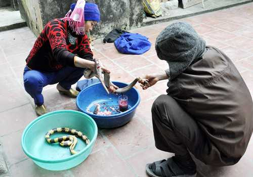 Việc cho rắn ăn cũng không phải dễ, theo ông Thư cho biết rắn ăn ít, mồi cũng đơn giản thường là nhái, chuột… Tận dụng mồi từ đàn vịt nuôi như trứng hỏng, vịt con chết đều có thể nấu chín băm nhỏ cho rắn ăn. Tay thoăn thoắt băm mồi cho rắn, ông kể: “Nhưng giống rắn chăm cho ăn quá cũng chết, một tuần rắn chỉ ăn hai bữa. Trời ấm rắn ăn nhiều, nhanh tiêu, càng lạnh càng ăn ít. Xưa tôi thường bắt nhái, chuột làm mồi nhưng thấy mất thời gian nên nuôi vịt để tận dụng mồi thừa lại có thêm nguồn thu phụ”. Việc nuôi thêm đàn vịt cũng giúp ông bảo đảm nguồn thức ăn không sợ rắn mắc bệnh.