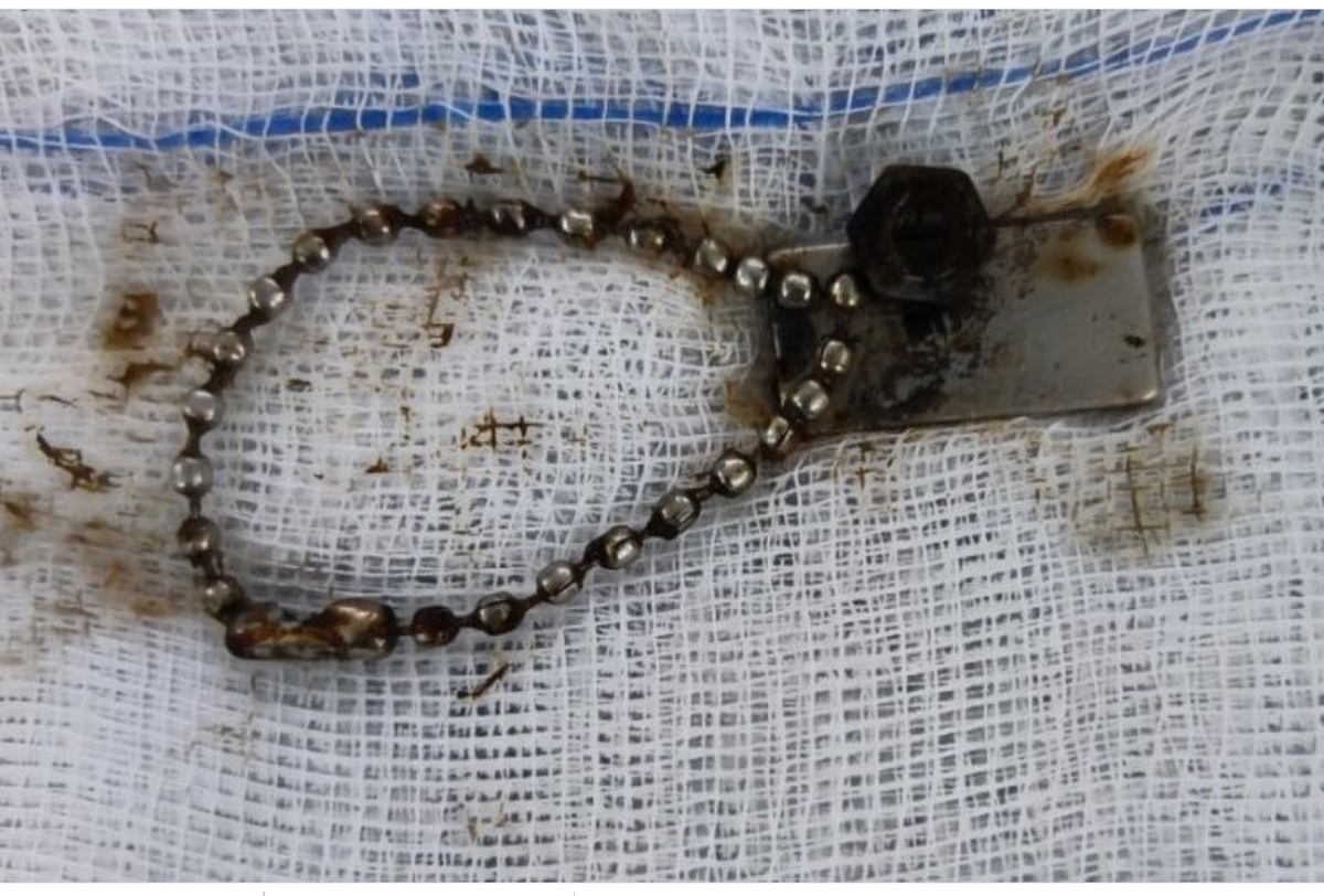 Dị vật là chuỗi hạt kim loại nhỏ kèm đai ốc và một miếng nam châm hình chữ nhật dài 2cm.