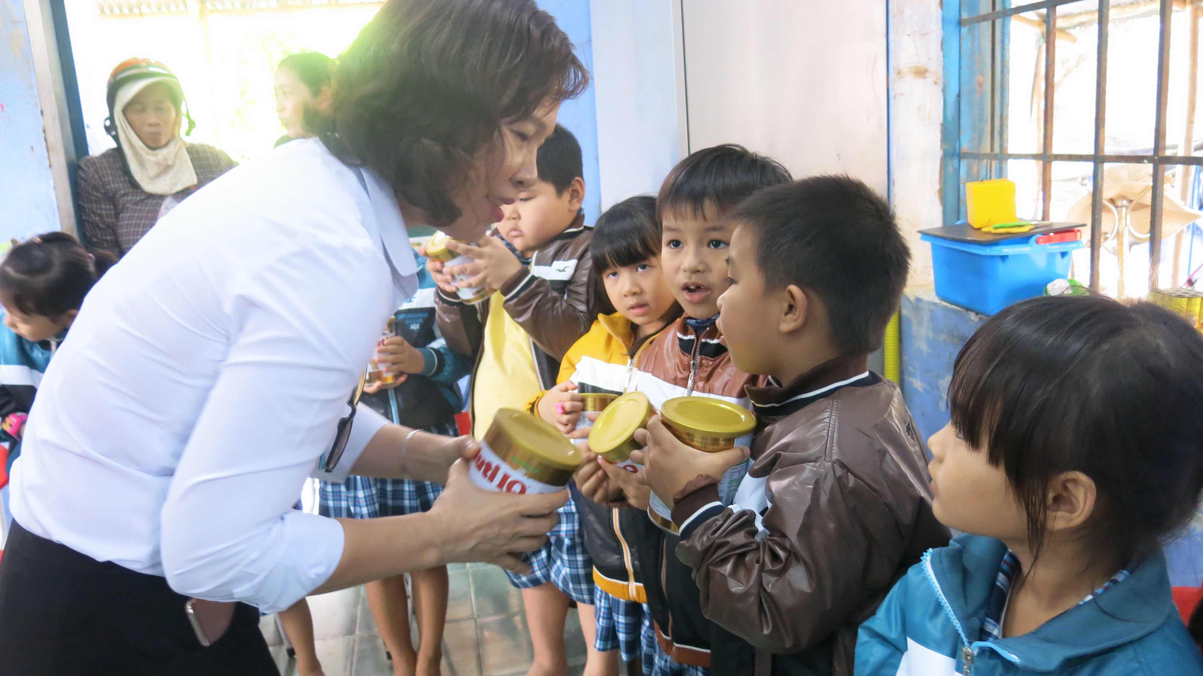 Bà Trần Thị Minh Nguyệt, Phó Chủ tịch HĐQT công ty NutiFood trao quà cho trẻ em mầm non ở huyện Tuy An