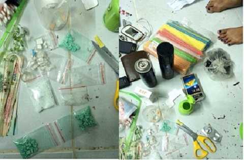 Qua khám xét, cảnh sát thu giữ được gần 100 viên ma túy tổng hợp màu xanh được đựng trong nhiều bịch nilon, nhiều cục chất bột màu trắng nghi là heroin, nhiều gói nilong có chứa chất tinh thể màu trắng nghi là ma túy đá.
