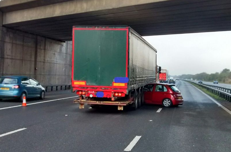 Một chiếc xe con "chui gầm" xe tải. (Ảnh: Derby Telegraph)