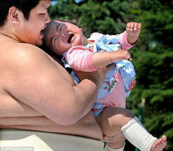 mạnh, các bố mẹ tại lễ hội Sumo thi nhau trêu cho con cái của mình khóc.