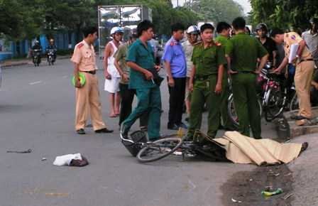 Lực tông khủng khiếp khiến 3 chiếc xe đạp bị hất tung theo nhiều hướng trên đường. Các nạn nhân cũng bị hất tung lên nắp kính gió rồi văng xuống đường bị chiếc xe kéo lê trên đường.