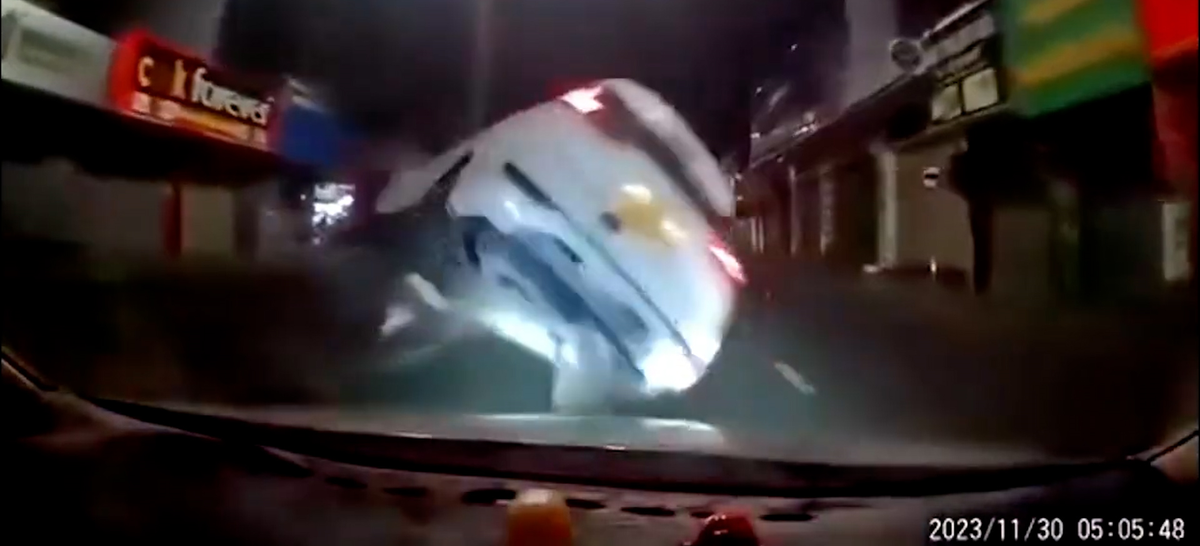 Ô tô bất ngờ đâm vào dải phân cách lật ngang ra đường