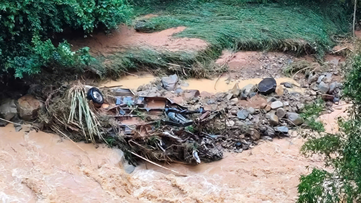 HIện trường vụ sạt lở đẩy ô tô khách, 1 xe ô tô con cùng nhiều xe máy đang lưu thông xuống suối ở Cao Bằng.