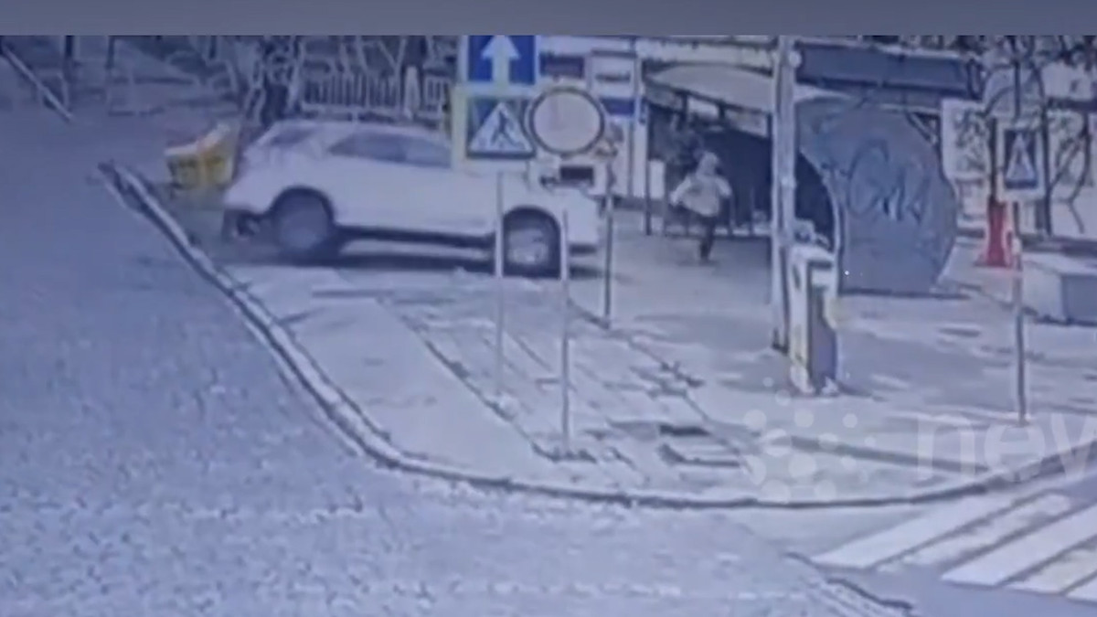 Ô tô đang chạy trên đường tại Kaliningrad, Nga bất ngờ chao đảo lao vào nhà chờ xe buýt và lật nhào.
