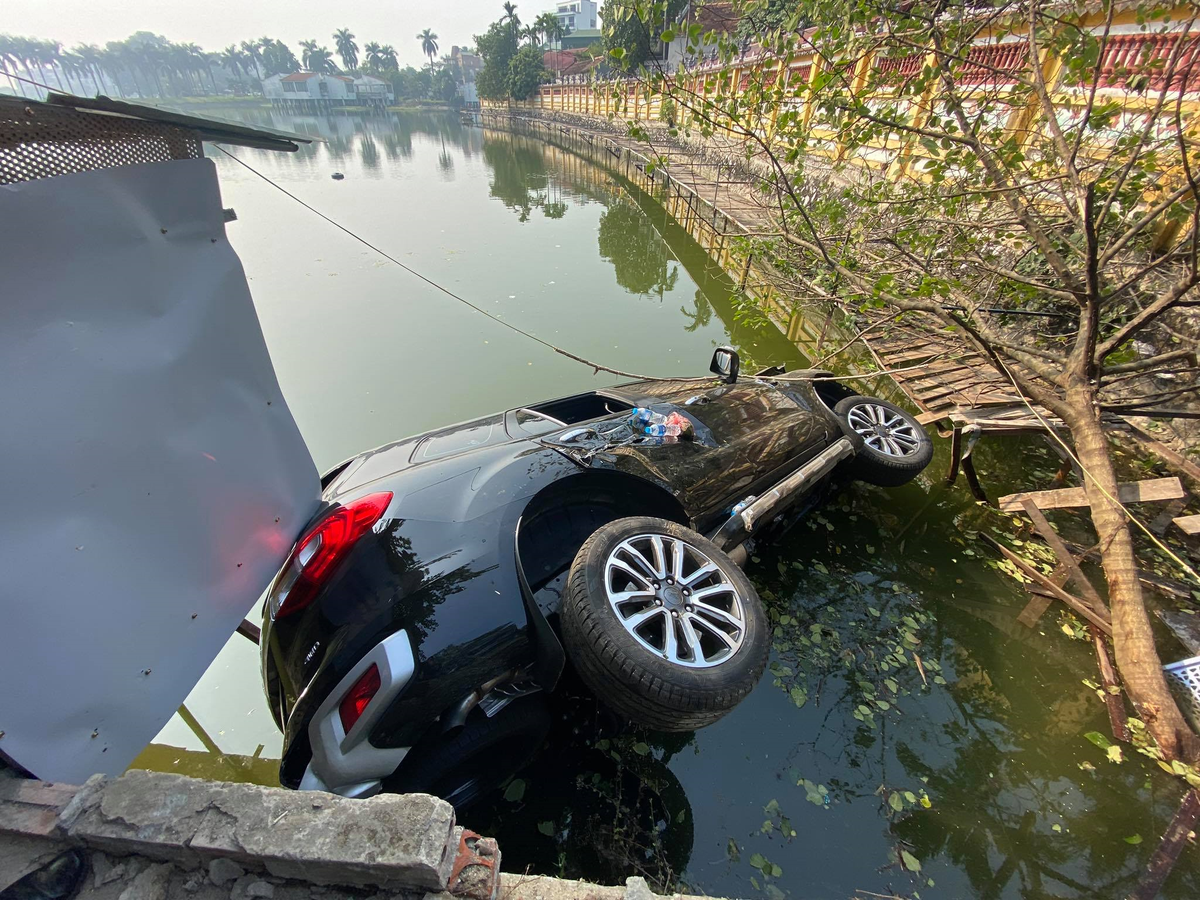 Chiếc xe lao cắm nghiêng xuống hồ. (Ảnh: CTV)