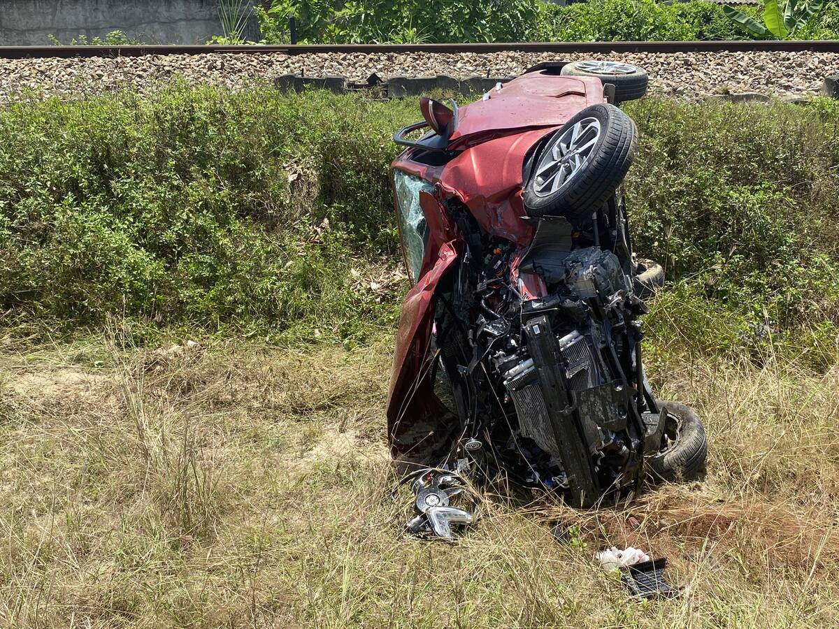 Ô tô con biến dạng, nằm lật nghiêng sau khi bị tàu hỏa đâm văng gần chục mét.